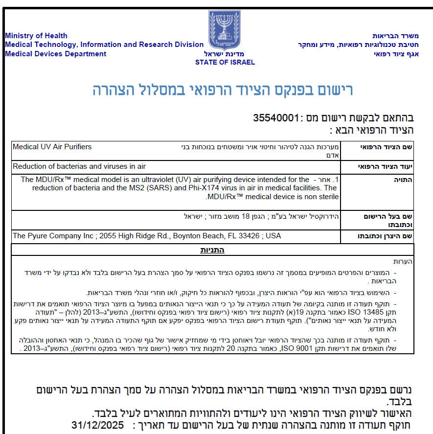 Hydroxyl Israel Medical רואה באוויר נקי ובסביבה מחוטאת חלק בלתי נפרד מרפואה מודרנית, בטוחה ואיכותית.